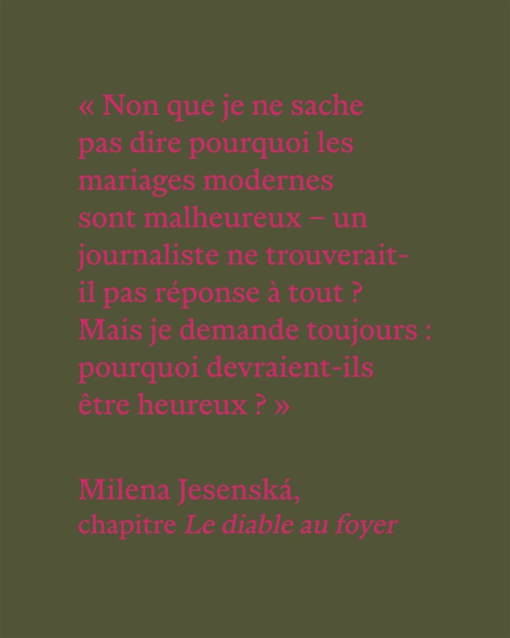 D’où mon amour pour le « Je » : je m’intéresse aux individualités et à leurs contradictions. Il n’est pas question de totaliser une pensée. Milena Jesenská passe son temps à se contredire, elle malaxe son sujet, écrit parfois une chose et son contraire sans que cela s’oppose. C’est ce qui la rend humaine et lui donne paradoxalement une certaine cohérence. Avec Mater Éditions, ce sont ces voix qui m’importent : des pensées qui acceptent leur complexité et ne rentrent dans aucun dogme.